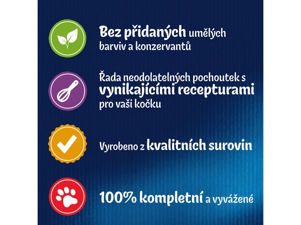 Složení:Maso a výrobky živočišného původu* (20 %, z toho kuře 8 %), bílkovinné extrakty rostlinného původu, ryby a vedlejší výrobky z ryb, vedlejší výrobky rostlinného původu, minerální látky, cukry