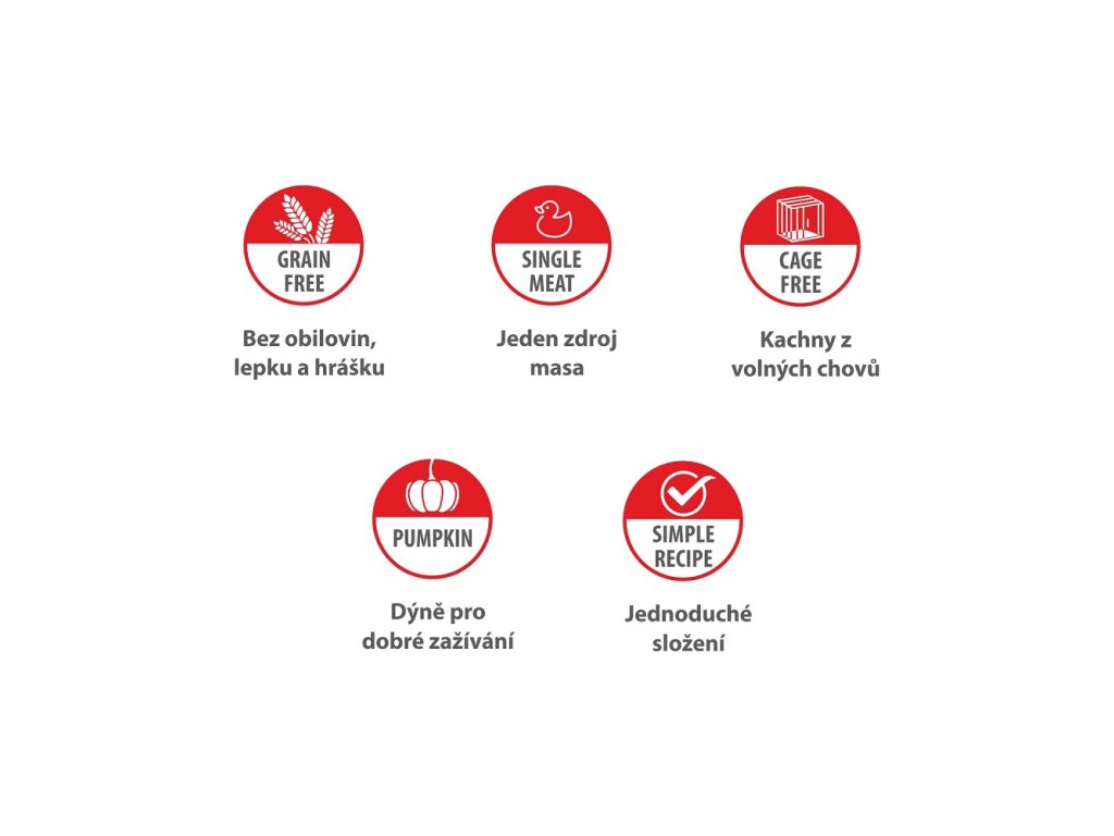 Kachní - Kachní maso je velmi bohaté na živočišné bílkoviny, které jsou nezbytné pro tvorbu a opravu svalové hmoty a kostí a k tvorbě potřebných hormonů a enzymů. Má tendenci být lehce stravitelné. Je bohaté na omega-3 mastné kyseliny, které mohou pomoci snížit zánět a podporu zdraví kůže a srsti. Obsahuje dále železo a vitamíny skupiny B, které jsou nezbytné pro zdraví vašeho zvířete. Mnoho zvířat také trpí alergiemi na běžný druh masa, jako je kuře nebo hovězí, a kachní maso tak může být vhodnou alternativou.