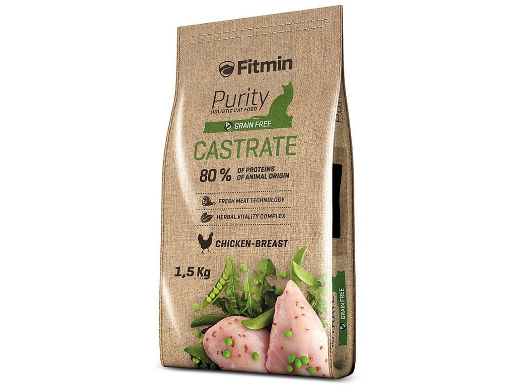 Kompletní superprémiové krmivo Fitmin pro dospělé kastarované či sterilizované kočky. Až 80 % proteinů živočišného původu.