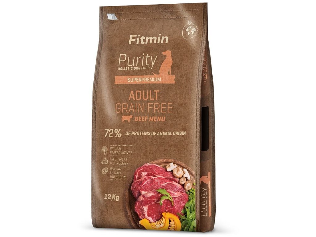 Holistické krmivo Fitmin Purity pro dospělé psy středních, velkých a obřích plemen. Čerstvé hovězí maso s bylinkami a houbičkami SHIITAKE na špenátových lístcích s plátky dýně. 71% proteinu živočišného původu.