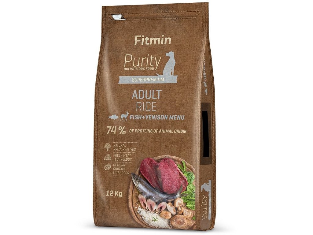 Holistické krmivo Fitmin Purity pro dospělé psy všech plemen. Směs zvěřiny a rybího masa s jablečnými měsíčky a houbičkami shiitake. 74% proteinu živočišného původu.
