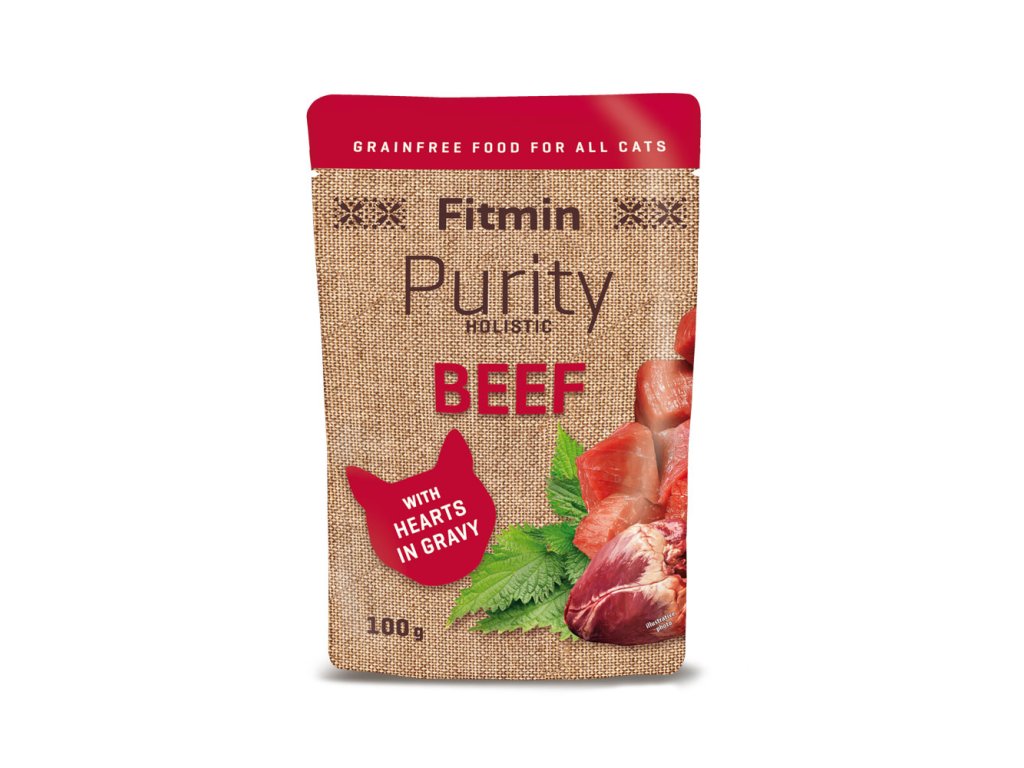 Fitmin Purity Cat Pouch Beef je ideální volbou pro každou kočku včetně koťat. Tyto lahodné 100g kapsičky obsahují poctivé maso ve vývaru, bez přidaných obilovin, cukrů, barviv a konzervantů. S obsahem 96 % hovězího masa a srdcí ve vývaru, které jsou bohatým zdrojem taurinu, podporují zdravý zrak, srdeční činnost a imunitní systém. Kopřiva v kapsičkách podporuje imunitu a zdraví močových cest, zatímco prebiotika zlepšují trávení. Kapsičky jsou doplněné o potřebné vitamíny a minerály, což z nich činí ideální volbu pro kočky, které odmítají granule. Vyzkoušeno i těmi největšími kočičími labužníky.