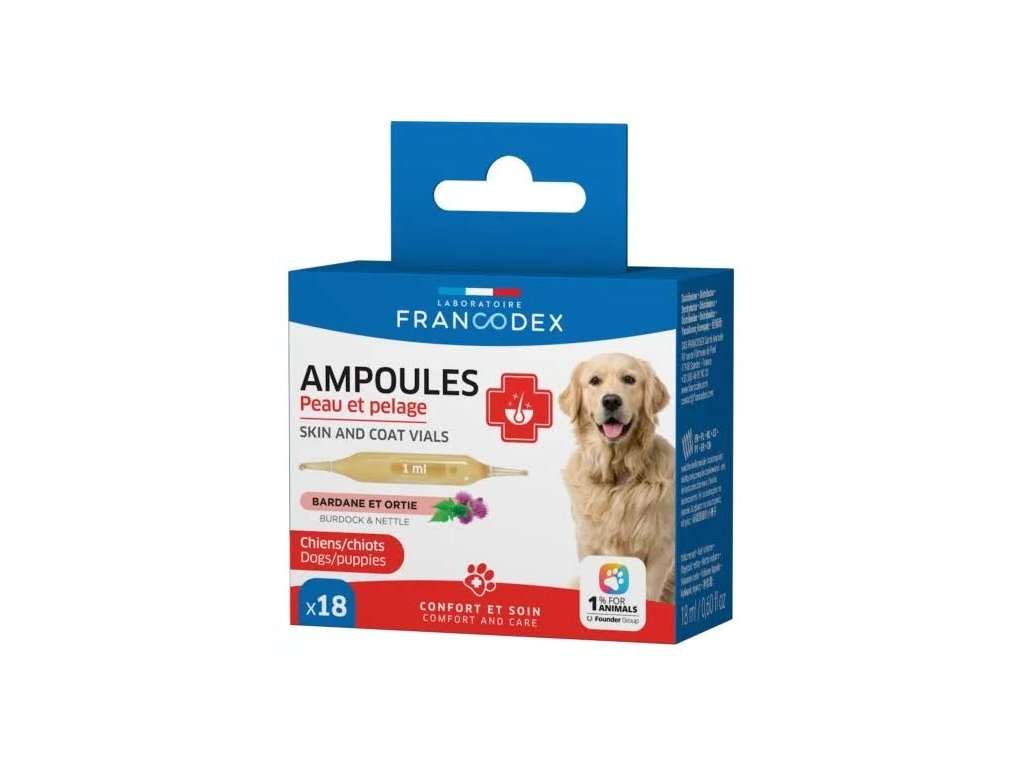 Ampulky SKIN AND COAT jsou speciálně navrženy tak, aby podporovaly zdraví kůže a krásnou srst psů a štěňat, obsahují rostlinné extrakty (lopuch, kopřiva) v kombinaci s paraprobiotiky a postbiotiky, které napomáhají zdravé regeneraci kůže vašeho mazlíčka a zároveň posilují jeho přirozenou trávicí flóru.