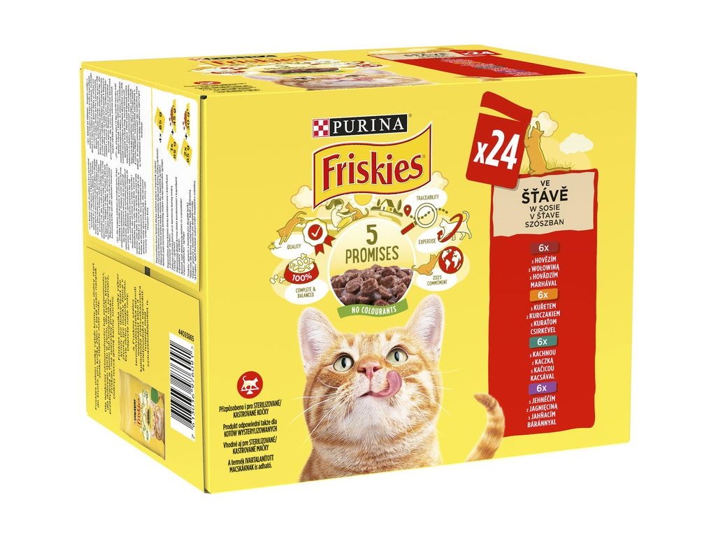 Friskies Adult Cat hovězí kuře kachna jehně kachna ve šťávě 24 x 85 g