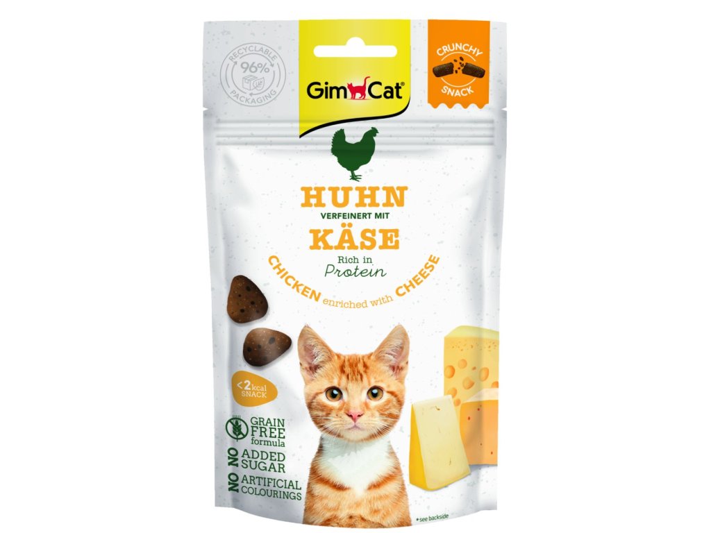 Hledáte skvělou změnu pro svou kočku? Pak má Gimcat pro vaši kočku to pravé zdravé občerstvení. Crunchy Snacks od Gimcat nabízí speciální kombinaci cenného zdroje bílkovin z kuřecího masa a navíc byl extra chutný díky kombinaci se sýrem, která zaručeně přesvědčí každého gurmána! Recept, který je zcela bez obilovin a bez umělých barviv a aromat.