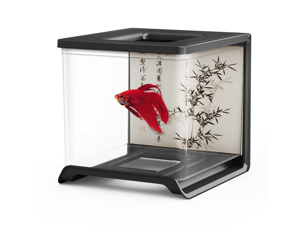 Mini akvárium vhodné pro Betty. minimalistický design plastová nádržka s odklopným víkem a otvorem pro krmení vyměnitelné pozadí (4 scenérie) možno připevnit i na stěnu (úchytný systém není součástí balení) Objem: 1,8l Rozměr: 14,5x16x14,5cm Barva: černá