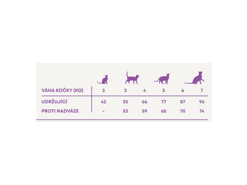 Krmný návod: změnu krmiva je třeba provádět postupně po dobu 7 dní. Jako návod použijte tabulku s dávkováním. Denní množství potravy se může pro každou kočku lišit, záleží na úrovni její aktivity, plemeni a podmínkách prostředí. Denní krmnou dávku podávejte rozdělenou na 2 porce denně, nepoužívejte zbytky krmiva z předchozího dne. Kočka musí mít vždy přístup k čisté, čerstvé vodě. Skladování: skladujte na chladném a suchém místě. Obal by měl být po použití vždy bezpečně uzavřen.