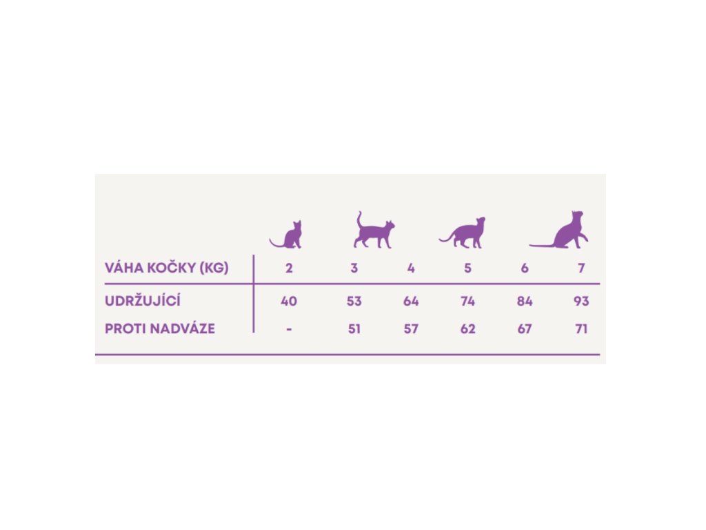 Krmný návod: změnu krmiva je třeba provádět postupně po dobu 7 dní. Jako návod použijte tabulku s dávkováním. Denní množství potravy se může pro každou kočku lišit, záleží na úrovni její aktivity, plemeni a podmínkách prostředí. Denní krmnou dávku podávejte rozdělenou na 2 porce denně, nepoužívejte zbytky krmiva z předchozího dne. Kočka musí mít vždy přístup k čisté, čerstvé vodě. Skladování: skladujte na chladném a suchém místě. Obal by měl být po použití vždy bezpečně uzavřen.