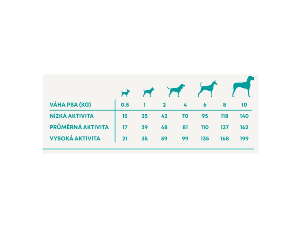 Krmný návod: změnu krmiva je třeba provádět postupně po dobu 7 dní. Jako návod použijte tabulku s dávkováním. Denní množství potravy se může pro každého psa lišit, záleží na úrovni jeho aktivity, plemeni a podmínkách prostředí. Denní krmnou dávku podávejte přednostně rozdělenou na 2 až 3 porce denně, a to vždy ve stejnou dobu. Pes musí mít vždy přístup k čisté, čerstvé vodě. Skladování: skladujte na chladném a suchém místě. Obal by měl být po použití vždy bezpečně uzavřen.
