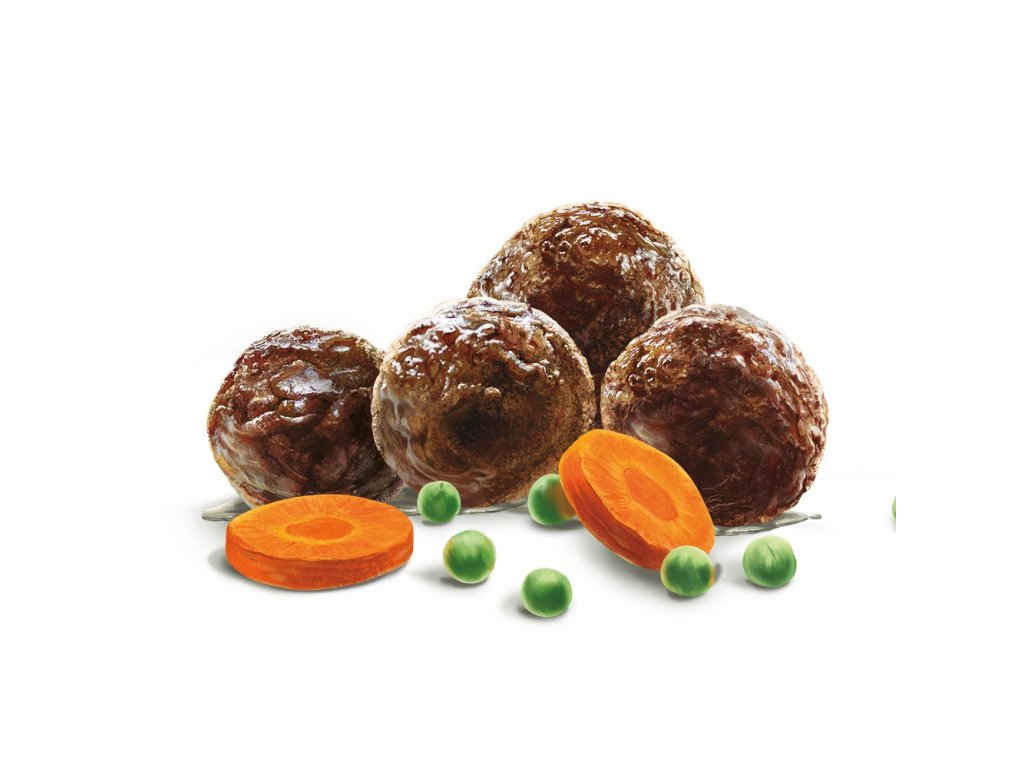 Kompletní mokré krmivo ve tvaru masových kuliček pro dospělé psy všech plemen.
