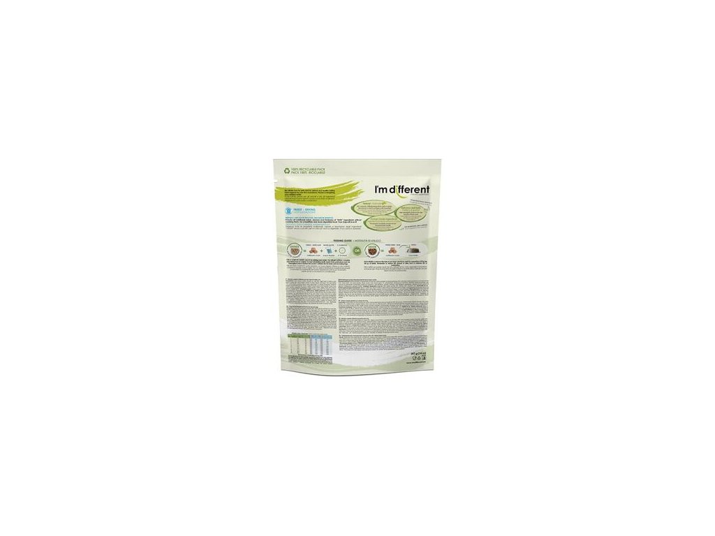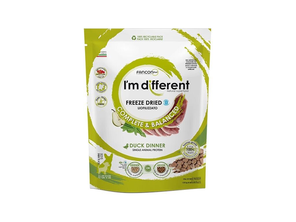 Složení: čerstvé kachní maso 50 %, čerstvá kachní játra a čerstvé kachní srdce 30 %, čerstvý hrášek, čerstvé zelené fazolky 1,5 %, čerstvé hrušky 1 %. 5%, čerstvá mrkev, čerstvá cuketa, bambusová vláknina, inulin, čerstvý jogurt 1%, rozmarýnový extrakt, směs tokoferolů (přírodní konzervant), droždí, směs extraktů ze sušeného ovoce (extrakt z hroznových jader, lesní borůvky, kvercetin, resveratrol, lesní borůvky, brusinky, třešně, sušené švestky, malinová semena, jahody) 0,025%