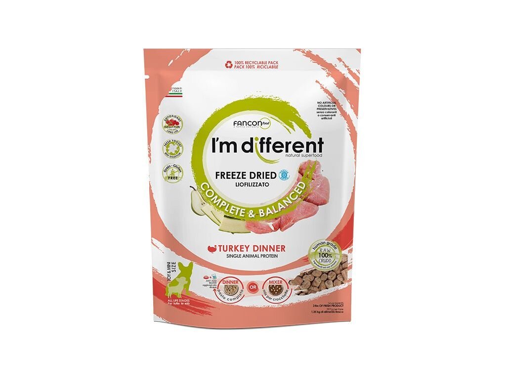 Složení: Čerstvé krůtí maso 40%, čerstvá krůtí játra a čerstvé krůtí srdce 40%, čerstvý hrášek, čerstvá cuketa 1,5%, čerstvé hrušky 1. 5%, čerstvá mrkev, čerstvé zelené fazolky, bambusová vláknina, inulin, čerstvý jogurt 1%, rozmarýnový extrakt, směs tokoferolů (přírodní konzervant), droždí, směs extraktů ze sušeného ovoce (extrakt z hroznových jader, lesní borůvky, kvercetin, resveratrol, lesní borůvky, brusinky, višně, sušené švestky, malinová semínka, jahody) 0,025%.