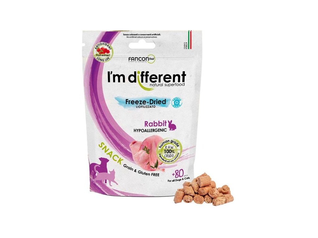 Složení: čerstvé králičí maso 65 %, čerstvá králičí játra 30 %, inulin, zeleninové aroma, extrakt z rozmarýnu, směs tokoferolů (přírodní konzervant), kvasnice, směs extraktu ze sušeného ovoce (extrakt z hroznových semínek, divoká borůvka, antioxidant kvercetin, resveratrol pro posílení imunity, divoká borůvka, brusinka, višeň, sušená švestka, semena malin, jahoda) 0,025 %