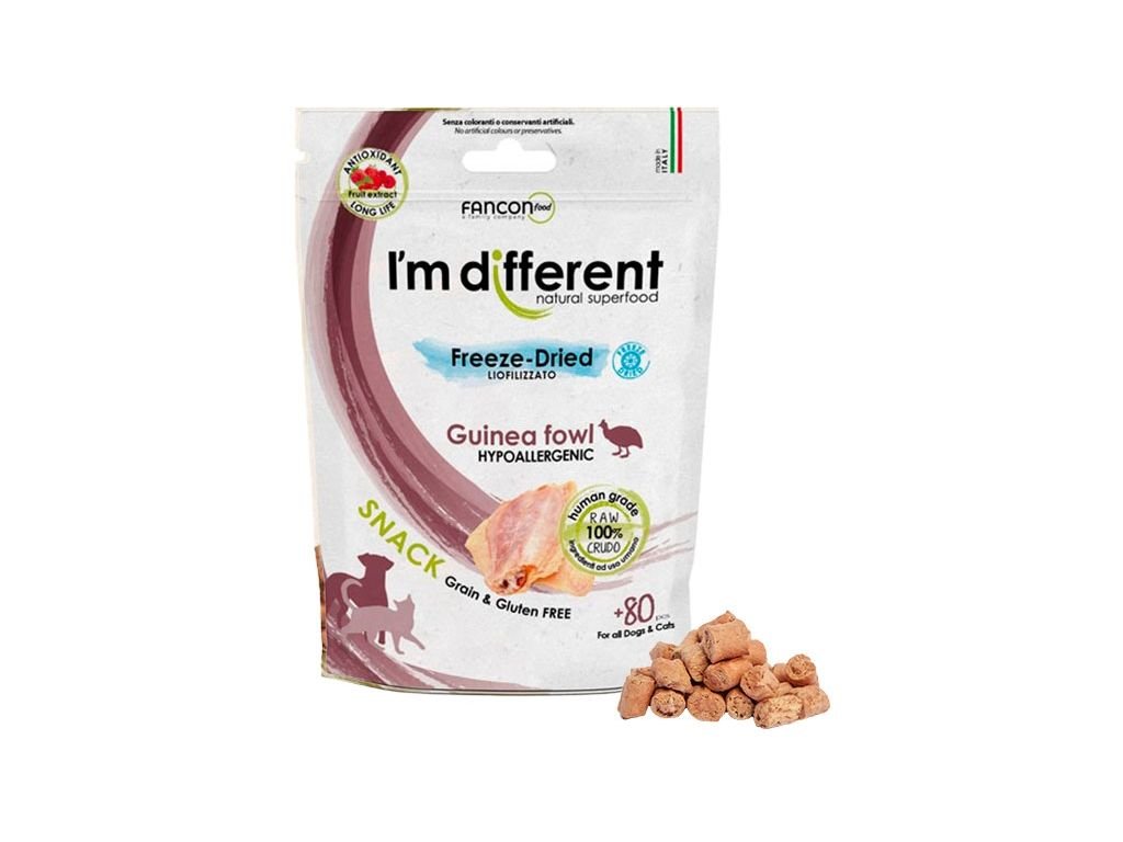 Složení: čerstvé maso z perliček 65 %, čerstvá perličková játra 30 %, inulin, rostlinné aroma, extrakt z rozmarýnu, směs tokoferolů (přírodní konzervant), kvasnice, směs extraktu ze sušeného ovoce (extrakt z hroznových semínek, divoká borůvka, antioxidant kvercetin, resveratrol pro posílení imunity, divoká borůvka, brusinka, višeň, sušená švestka, semena malin, jahoda) 0,025 %