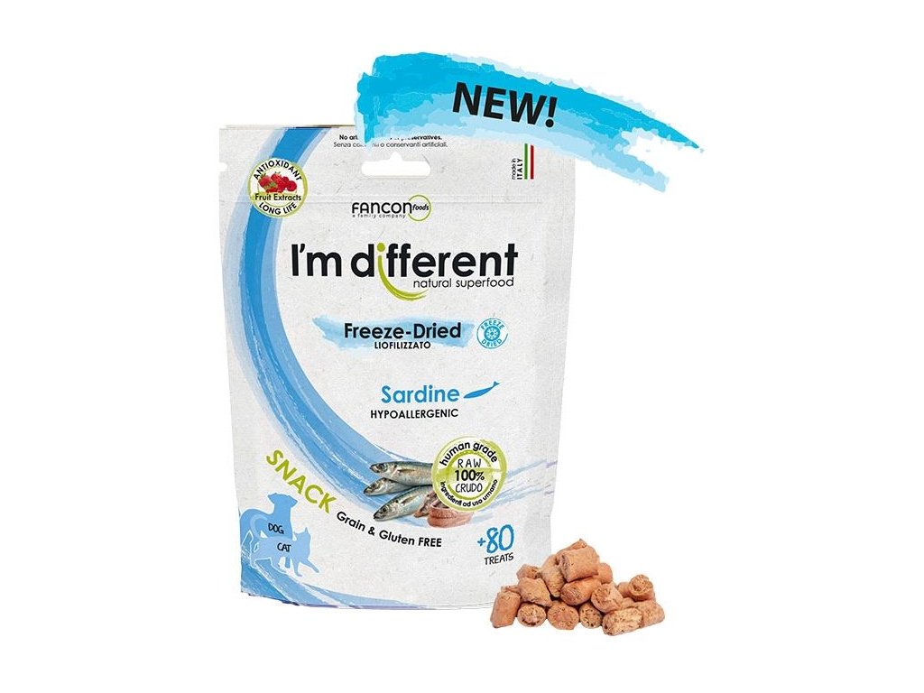 Složení: čerstvé sardinky 95 %, čekankový inulin - zdroj fruktooligosacharidů (FOS) min. 2 %, rostlinné aroma, extrakt z rozmarýnu, směs tokoferolů (přírodní konzervant), kvasnice, směs extraktu ze sušeného ovoce (extrakt z hroznových semínek, divoká borůvka, antioxidant kvercetin, resveratrol pro posílení imunity, divoká borůvka, brusinka, višeň, sušená švestka, semena malin, jahoda) 0,025 %