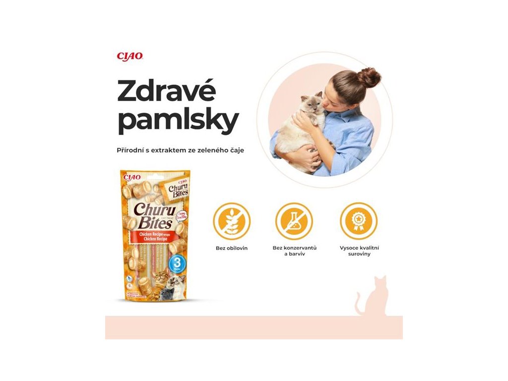 Churu Bites jsou šťavnaté, krémové a extra lahodné pamlsky ve tvaru polštářků s kuřetem z farmářského chovu plněné masovým pyré z divokého tuňáka a hřebenatky. Inovativní měkká konzistence pamlsků vám umožní trávit společné chvíle s vaší kočkou hravým a interaktivním způsobem. Pamlsky jsou 100% přírodní, nízkokalorické, bez obilovin (grain-free), bez přidaných konzervantů a umělých barviv. Jsou také ideální pro ukrytí tablety na odčervení či jiného léku, který je potřeba kočce nenásilně podat.
