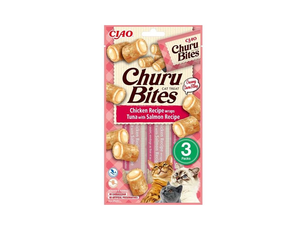 Churu Bites jsou šťavnaté, krémové a extra lahodné pamlsky ve tvaru polštářků s kuřetem z farmářského chovu plněné masovým pyré z divokého tuňáka a hřebenatky. Inovativní měkká...