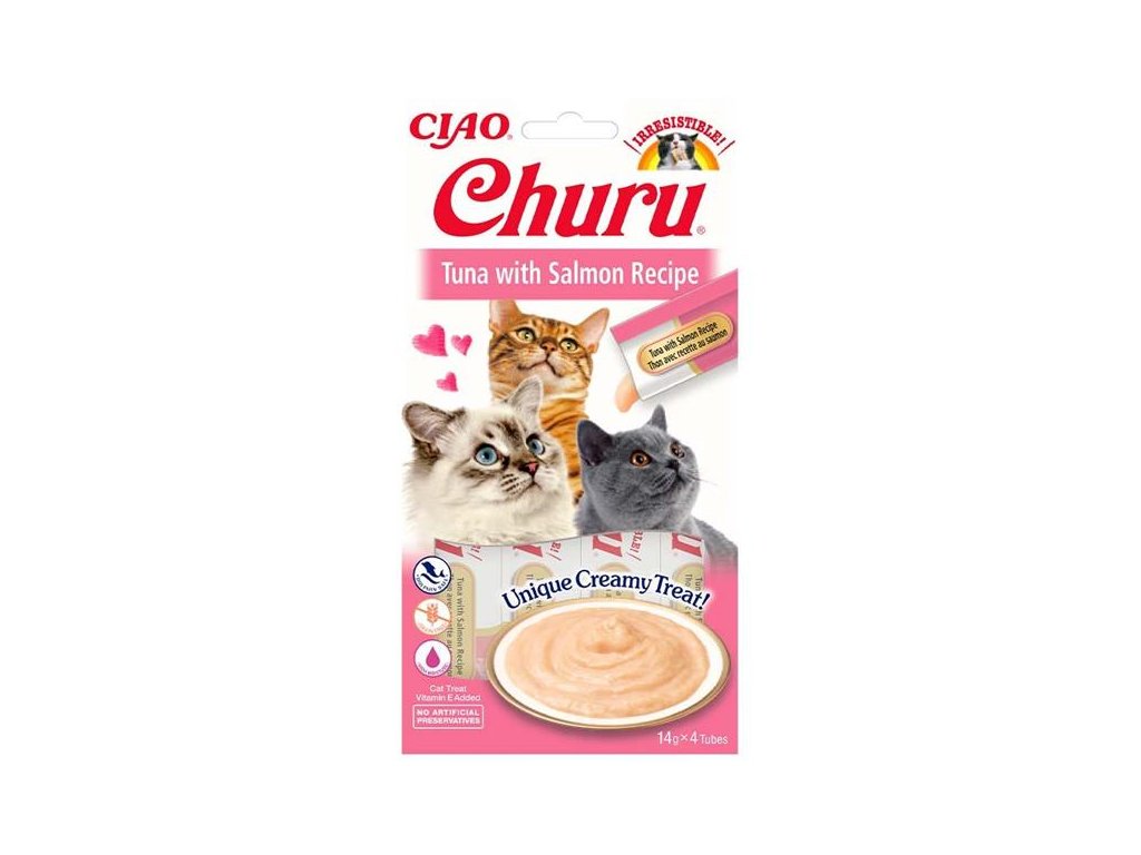 Churu masové pyré pro kočky s divokým mořským tuňákem a hřebenatkou.