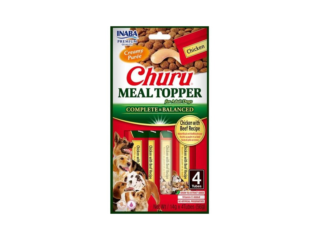 Zpestřete svému psovi suché krmivo lahodnou krémovou polevou s kuřetem a hovězím. Jemné pyré Churu Meal Topper je možné používat také jako kompletní a vyvážené krmivo nebo lízací pamlsek. Je vyrobené ze surovin v kvalitě pro lidskou spotřebu, neobsahuje obiloviny, dochucovadla, konzervační látky ani umělá barviva. Má vysoký obsah vody, čímž přispívá k hydrataci organismu a celkovému zdraví psů. Navíc je obohaceno extraktem ze zeleného čaje, vitamíny a minerály.