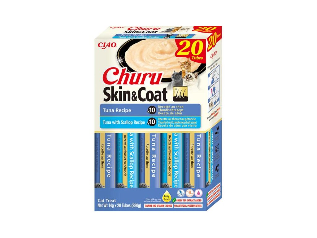 Výběr krémových pamlsků Churu Skin & Coat ve variacích s tuňákem. Krémy jsou obohacené o omega-3 a omega-6 mastné kyseliny pro zdravou kůži a krásnou srst. Jde o 100% přírodní a zdravé mlsání s nízkým obsahem kalorií, bez konzervantů, chemických aromat, barviv a umělých dochucovadel, vhodné pro kočky všech věkových kategorií. Inovativní měkká konzistence pamlsků Churu vám umožní trávit společné chvíle s vaší kočkou hravým a interaktivním způsobem.