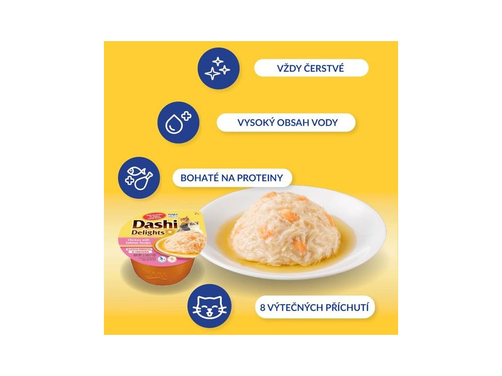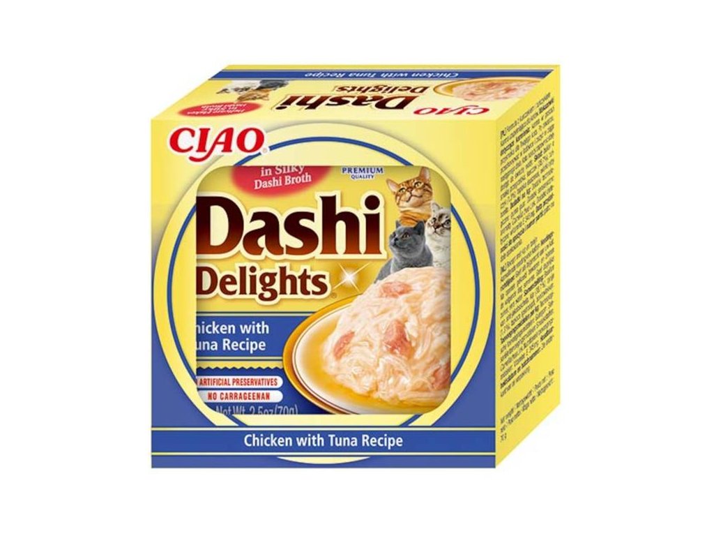 Kuřecí maso, tuňák a jemné tuňákové vločky v lahodném vývaru. Daši je tradiční japonský rybí vývar z tuňákových vloček známý svou výjimečnou, lahodnou chutí. Jeho zařazení do jídelníčku vaší kočky může dodat krmení nový rozměr a učinit z něj skutečný zážitek. Nejde jen o chuť, daši poskytuje důležité živiny včetně vitamínů a minerálů a díky nízkému obsahu kalorií a tuku je zdravým doplňkem stravy. Je to produkt na bázi vývaru, obsahuje tedy vysoké množství vody, čímž přispívá k hydrataci organismu a k prevenci potíží močového ústrojí.Všechny produkty Inaba jsou bez obilovin (grain-free), zbytečných ingrediencí a pochybných přísad a jsou vyrobené z pravého mořského tuňáka a kuřat chovaných na farmách. Jsou hydratující, výživné a vždy lahodné.