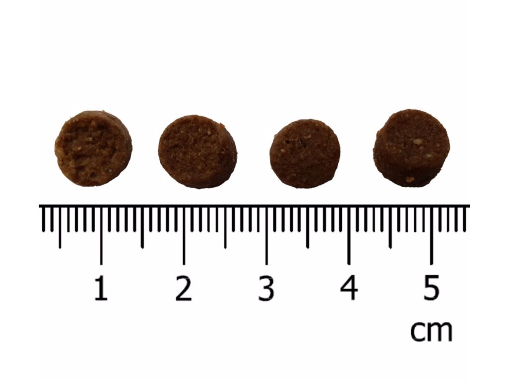 Analytické složky: Protein 28 %, hrubý tuk 16 %, hrubá vláknina 3,5 %, hrubý popel 7,5 %, vápník 1,2 %, fosfor 0,9 %, vlhkost 10 %.
