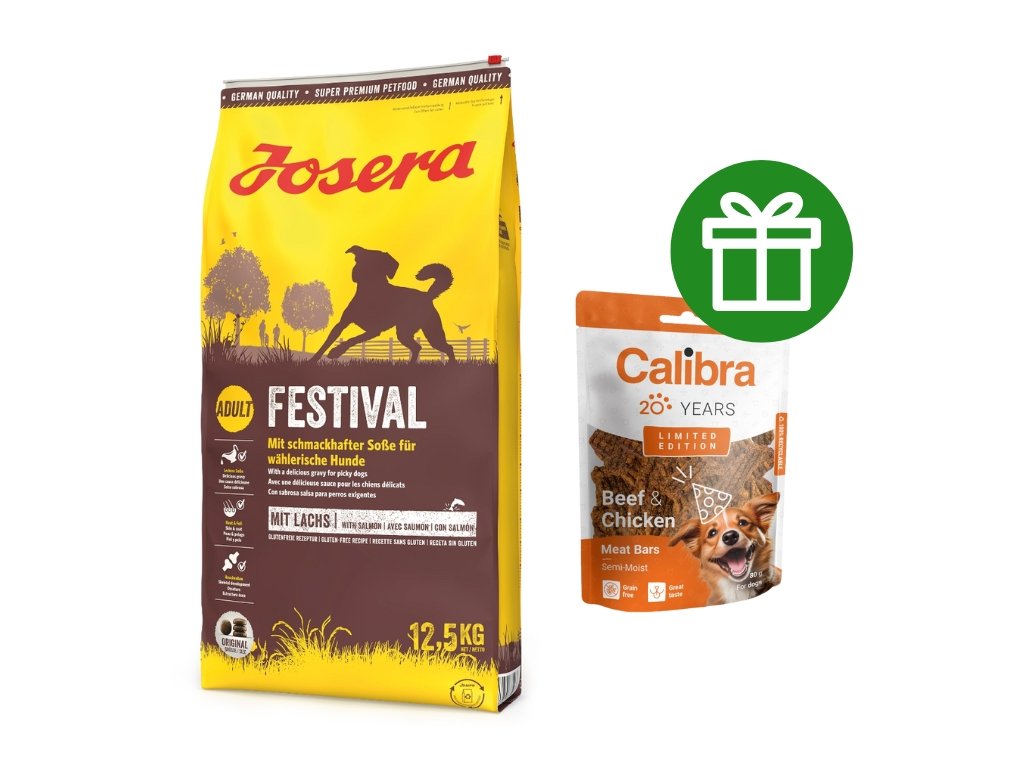 Obzvlášť aromatické a chutné, křupavé granule od Josera Festival s práškovou omáčkou nabízejí Vašemu náročnému pejskovi jedinečný chuťový zážitek jak v suché, tak i mokré formě. Vyvážená receptura s lososem je bohatá na energii pro aktivní a sportovně založené psy. Různé a snadno absorbovatelné výživové látky se postarají o pohodu a aktivitu. Josera Festival se vyznačuje vyváženým obsahem vápníku, fosforu, vitamínu C, manganu a mědi. Tento komplex vitálních látek se postará o silnou stavbu kostí a zdravé klouby. Cenné mastné kyseliny, zinek a měď podporující zdraví kůže a lesk srsti. Neobsahuje žádná umělá barviva, aromata, konzervační látky, ani geneticky upravované suroviny. Neobsahuje přísady, které mohou způsobovat alergie, jako jsou pšenice, cukr, sója nebo mléčné produkty. Kvalita všech přísad je neustále kontrolována. Kvůli zachování cenných vlastností, jsou granule baleny do praktického, znovuuzavíratelného sáčku AromaSafe.Josera Festival v přehledu: