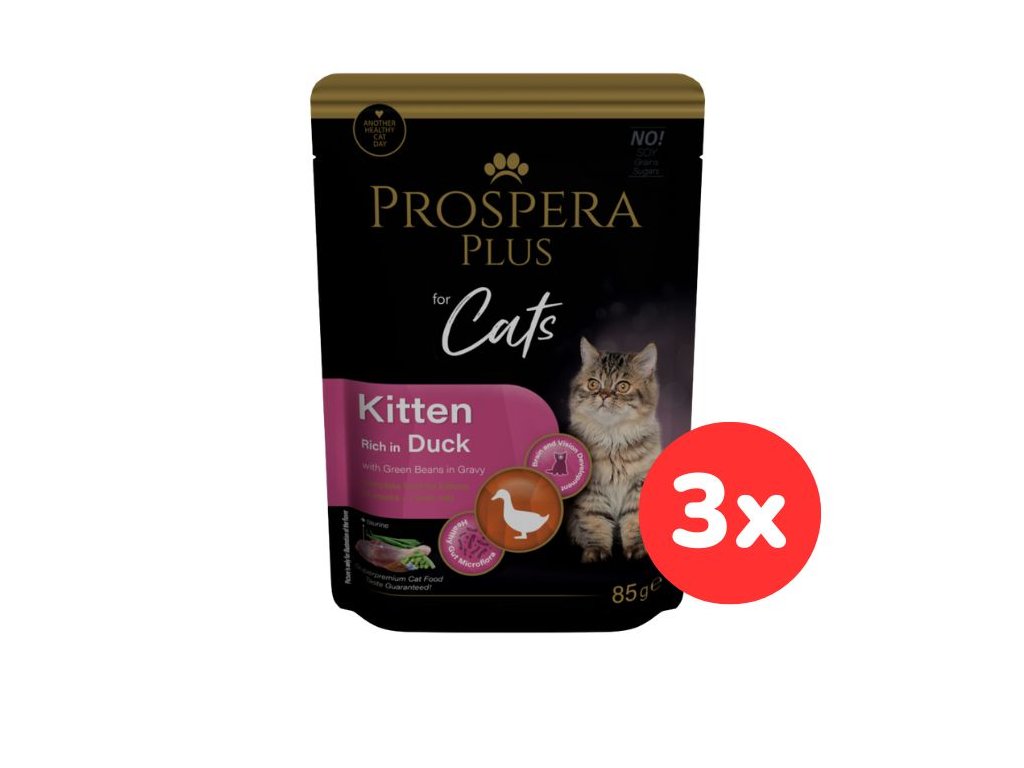 Kompletní krmivo pro koťata ve věku od 4 týdnů do 1 roku v podobě kapsičky s kachnou a zelenými fazolkami.