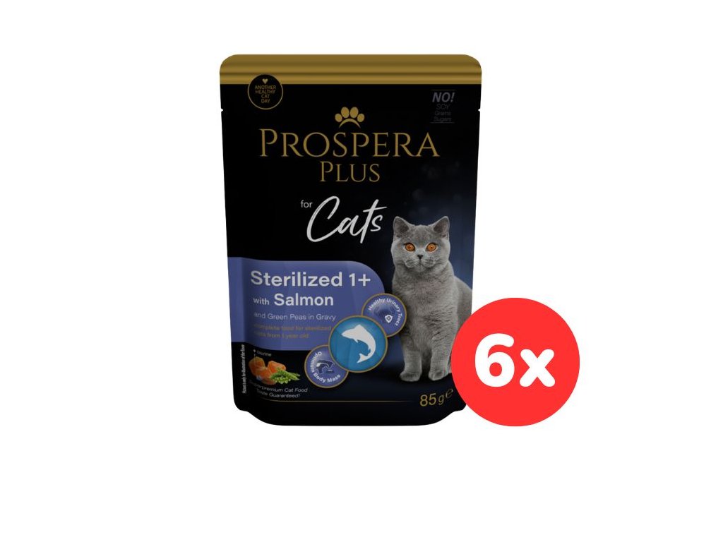 Kompletní a vyvážené krmivo pro kastrované kočky od 1 roku v podobě kapsičky s lososem a zeleným hráškem v omáčce.