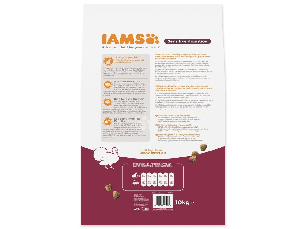 Krmivo IAMS for Vitality Sensitive Digestion pro dospělé a starší kočky s vysokým obsahem krůtího masa je 100% kompletní a vyvážené, odborníky sestavené krmivo, které podporuje sedm znaků zdraví a vitality kočky a pomáhá s citlivým trávením. Veškeré živiny jsou obsažené v lahodné receptuře s 88% obsahem živočišných bílkovin, na které si vaše kočky pochutnají každý den.