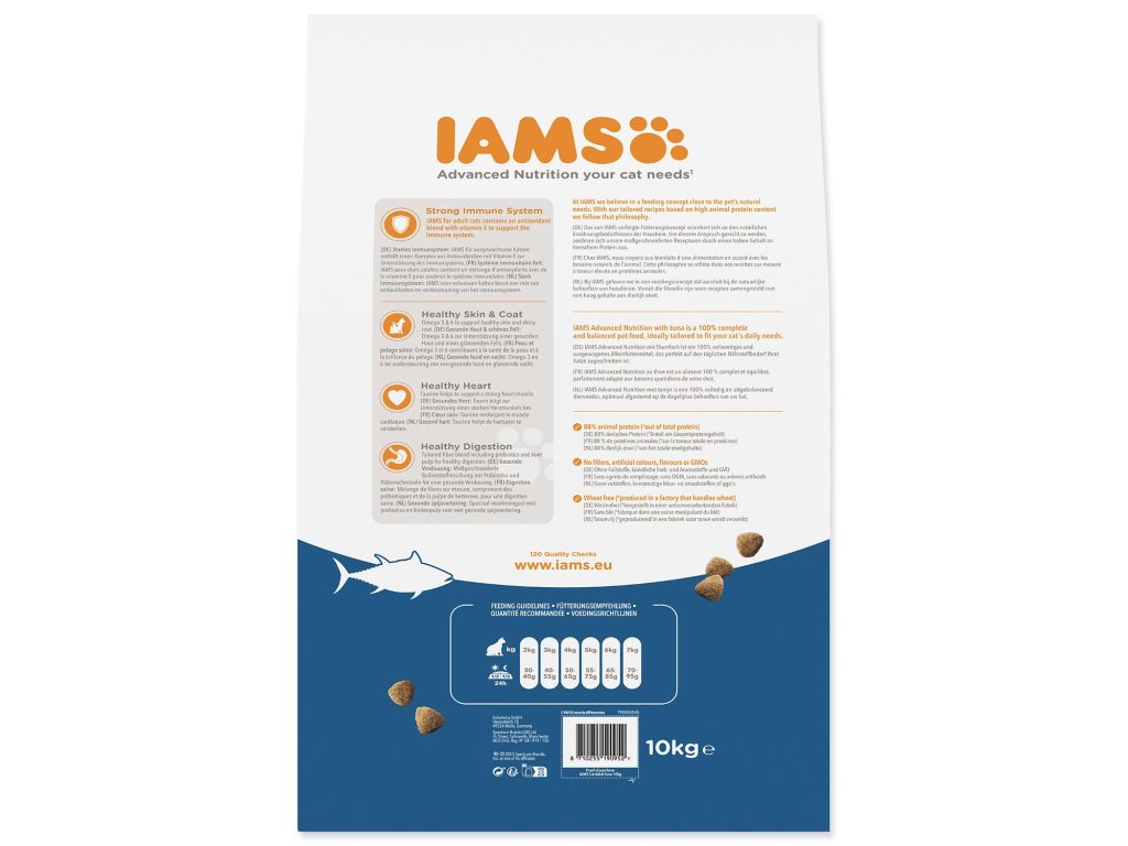 Krmivo IAMS for Vitality pro dospělé kočky s tuňákem je 100% kompletní a vyvážené, odborníky sestavené krmivo, které podporuje sedm znaků zdravé vitality kočky a zajistí jí zdravou kůži a lesklou srst. Veškeré živiny jsou obsažené v lahodné receptuře s 88% obsahem živočišných bílkovin, aby si váš mazlíček mohl užívat každý den naplno.