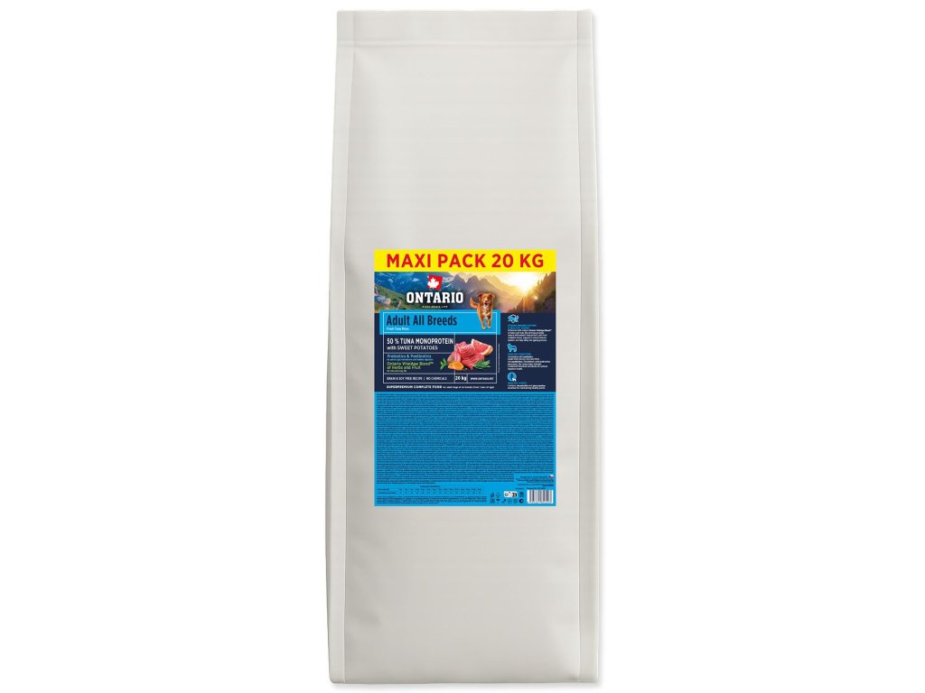 Složení:Čerstvý tuňák (26 %), dehydrovaná bílkovina z tuňáka (24 %), sladké brambory (12 %), červená čočka (10 %), bramborový škrob (8 %), tuk z drůbeže (6 %), sušené řepné řízky (3 %), přírodní rostlinné aroma (2,5 %), kvasnice, sušený kořen čekanky (2 %), lněné semínko (1 %), minerální látky, lososový olej (0,5 %), extrakt z yuccy (0,5 %), cholin chlorid, směs sušených bylin (tymián, rozmarýn, petržel), Ontario VitalAge Blend™, Active MOS, glukosamin (200 mg/kg), chondroitin (270 mg/kg), inaktivovaný Lacticaseibacillus paracasei HA-108.