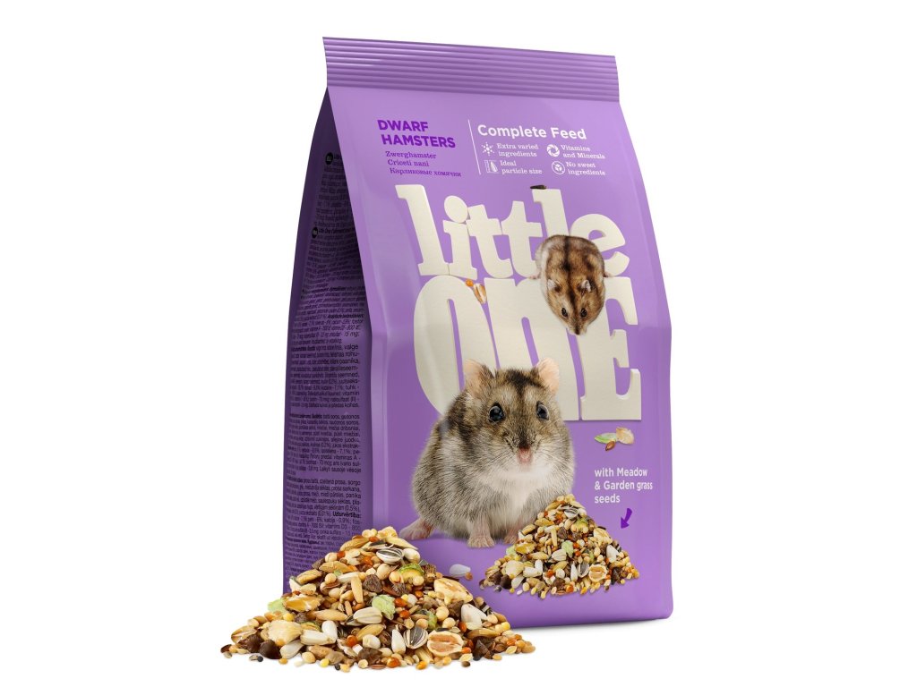 Little One - směs, která je kompletním krmivem pro trpasličí křečky. Pestré složení zaručeně uspokojí potřeby vašeho mazlíčka. Směs která je vyvážená, v souladu s individuálními nutričními potřebami zakrslých křečků a pokrývá všechny požadavky na živiny, vitaminy a minerály nezbytné pro zdraví vašeho mazlíčka. Má extra pestré složení a neobsahuje sladké přísady pro prevenci cukrovky. Přiměřeně malé částice bez ostrých hran, ze kterých je krmivo složeno jsou jako stvořené pro bezpečné naplnění lícních kapsiček.