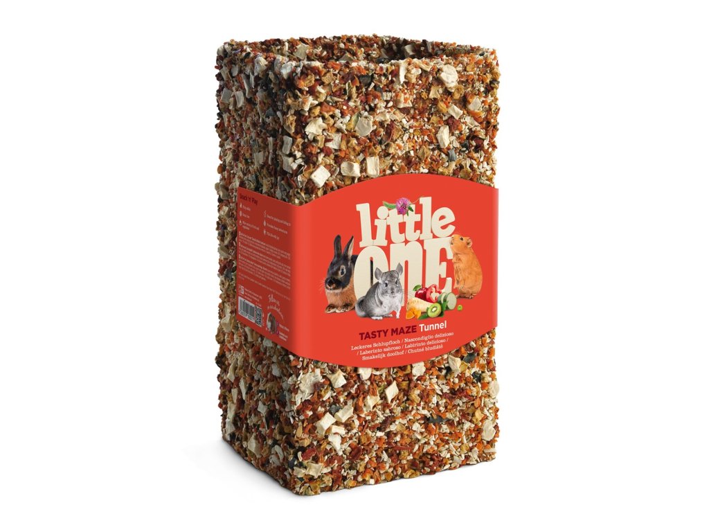 Little One tunel „Chutné bludiště“ je plně jedlá, poutavá hračka s pamlsky. Je pokryta různými kousky chutného ovoce a zeleniny, např. pastinák, cuketa, hrachové vločky, jablko a další, což činí tuto hračku s pamlsky pro domácí mazlíčky velmi atraktivní. Je jako stvořený pro hlodání, vykukování a prolézání. Navíc může být útulným místem k odpočinku a spánku. Velký tunel dává zvířeti pocit, že se nachází ve svém přirozeném prostředí, podporuje instinktivní chování při schovávání, zatímco ovoce a zelenin obohacují stravu o vitaminy a minerální látky.