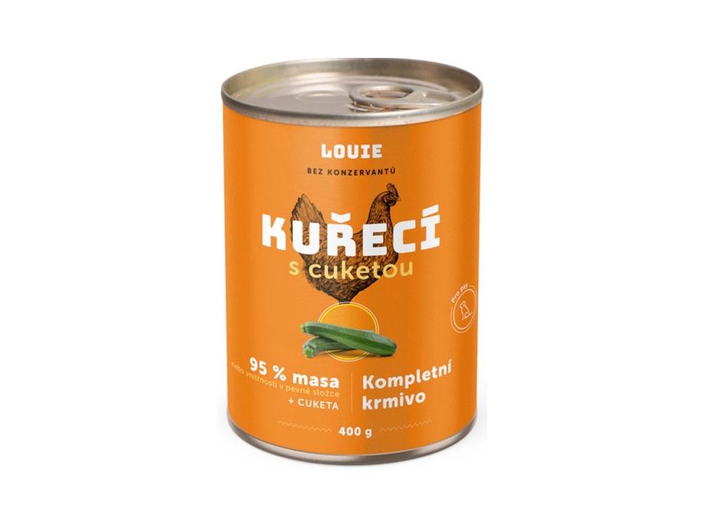 Masová konzerva pro psy Louie s obsahem 95% jemně namletého masa a s 5% rýže bez přidané želatiny, konzervantů, dochucovadel, barviv či stabilizátorů.