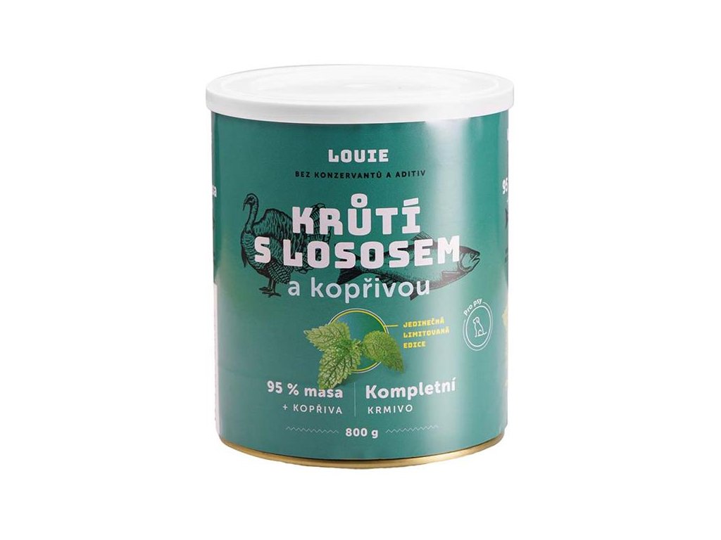 Složení: 95 % masa (krůtí, losos), kopřiva.