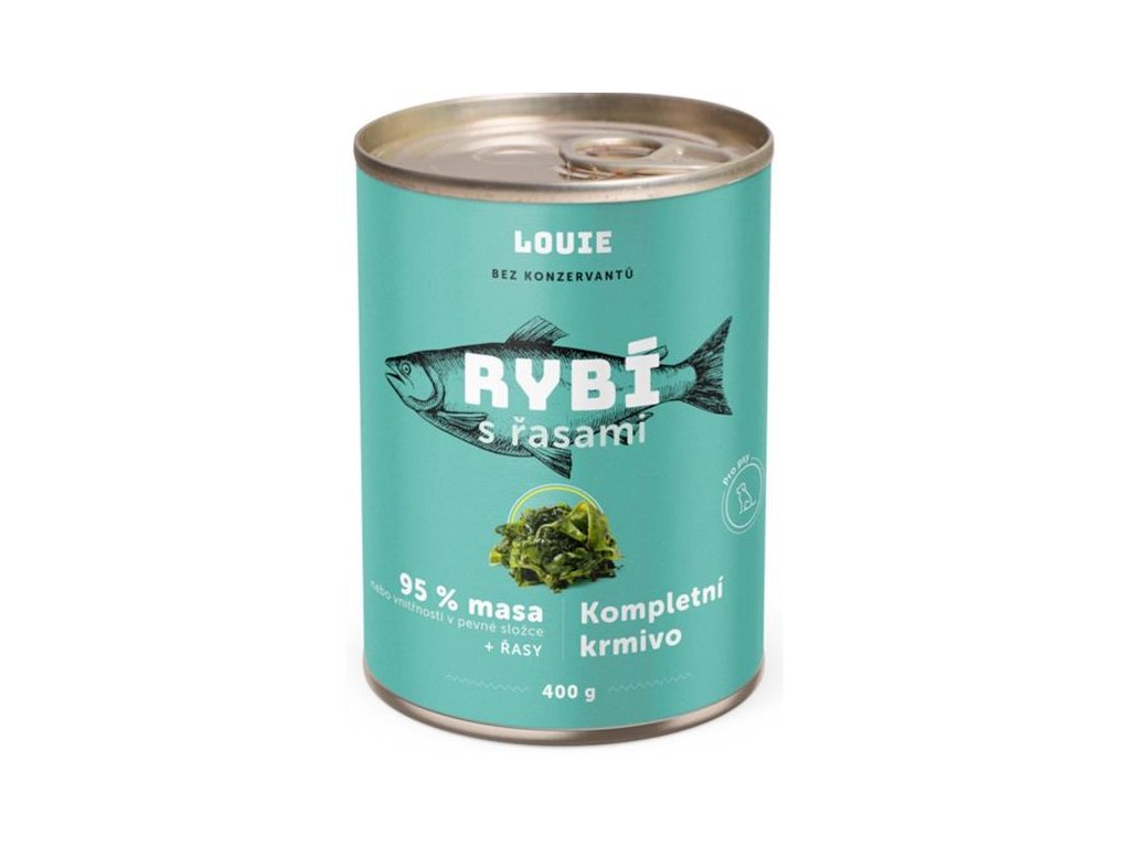Masová konzerva pro psy Louie s obsahem 95% jemně namletého masa a s 5% rýže bez přidané želatiny, konzervantů, dochucovadel, barviv či stabilizátorů.