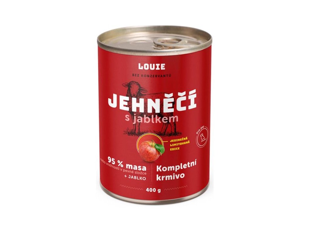 Masová konzerva pro psy Louie s obsahem 95% jemně namletého masa a s 5% rýže bez přidané želatiny, konzervantů, dochucovadel, barviv či stabilizátorů.