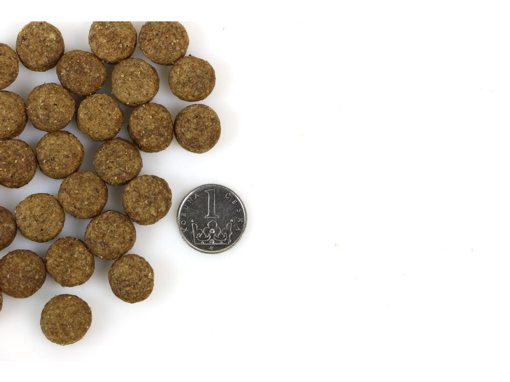 Garantované jakostní znaky: Hrubá bílkovina 23 %, hrubé tuky 12 %, hrubá vláknina 3,5 %, hrubý popel 8,5 %, vlhkost 9 %, vápník 1,4 %, fosfor 1,0 %, omega 3 0,8 %, omega 6 1,3 %