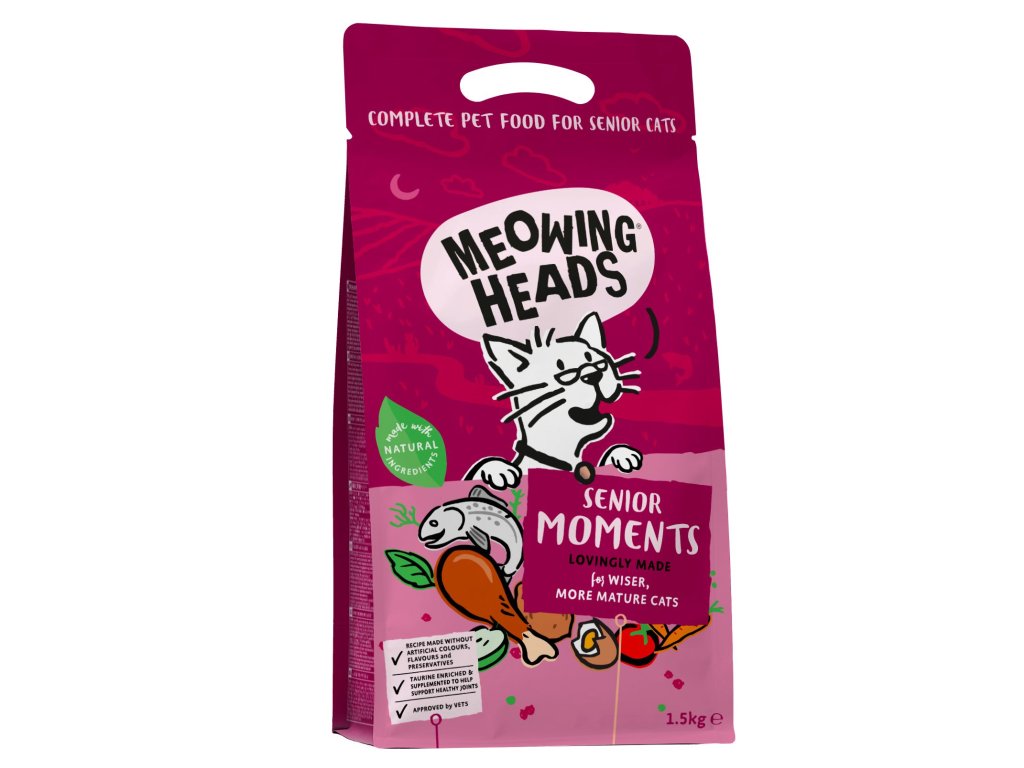 Kompletní suché krmivo MEOWING HEADS Senior Moments pro starší kočky.