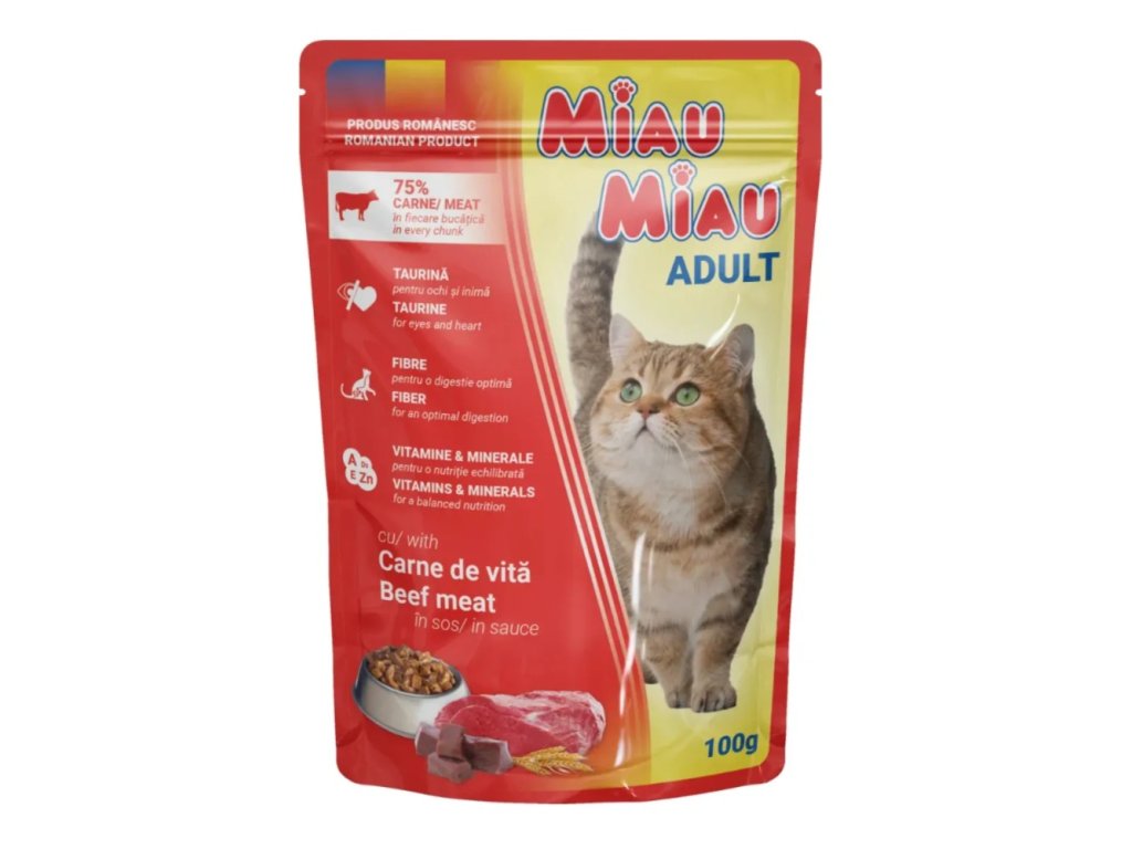 MIAU MIAU kapsička pro kočky s hovězím masem v omáčce.