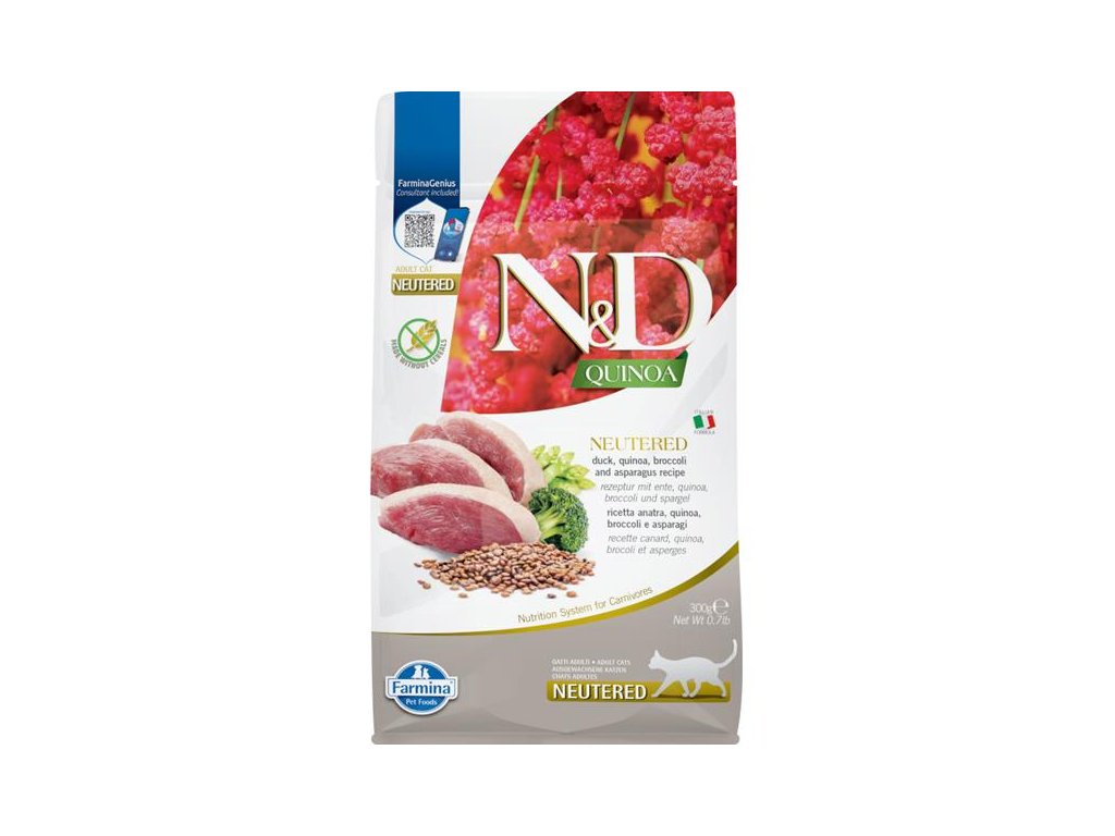 Vyvážené krmivo pro kastrované kočky obsahuje 91 % proteinů živočišného původu, nízký obsah tuku a vysoký podíl vlákniny. Hlavním zdrojem vysoce kvalitních bílkovin je kachní maso. Přidaná superpotravina quinoa obsahuje cca 13 % bílkovin s vysokou biologickou hodnotou a všechny esenciální aminokyseliny ve vyváženém poměru (ve světě rostlin velmi vzácné). Rybí olej zaručuje optimální poměr omega-3 a omega-6 mastných kyselin pro dobrou kondici kůže a srsti a jejich regenerační schopnost. Přidaný glukosamin a chondroitin vyživují kloubní chrupavky a stimulují růst a regeneraci kloubních tkání. Krmivo neobsahuje obiloviny, geneticky modifikované suroviny, umělá barviva, bílkoviny ze sóji ani hormonální nebo antibiotická rezidua.