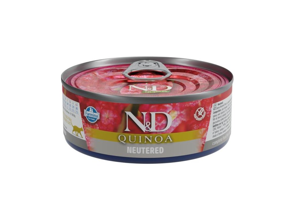 Kompletní vlhké krmivo je určené pro dospělé kastrované kočky všech plemen. Hlavním zdrojem vysoce kvalitních bílkovin je vepřové maso (plec a koleno). Přidaná quinoa v bio kvalitě pěstovaná v Itálii podporuje trávení, absorpci živin a celkově zdraví trávicího traktu. Dále je bohatá na vzácné aminokyseliny a přírodní antioxidanty a má nízký glykemický index. Rybí olej zaručuje optimální poměr omega-3 a omega-6 mastných kyselin pro dobrou kondici kůže a srsti a jejich regenerační schopnost. Přidaný glukosamin a chondroitin vyživují kloubní chrupavky a stimulují růst a regeneraci kloubních tkání. Krmivo neobsahuje obiloviny, geneticky modifikované suroviny, umělá barviva, bílkoviny ze sóji ani hormonální nebo antibiotická rezidua.