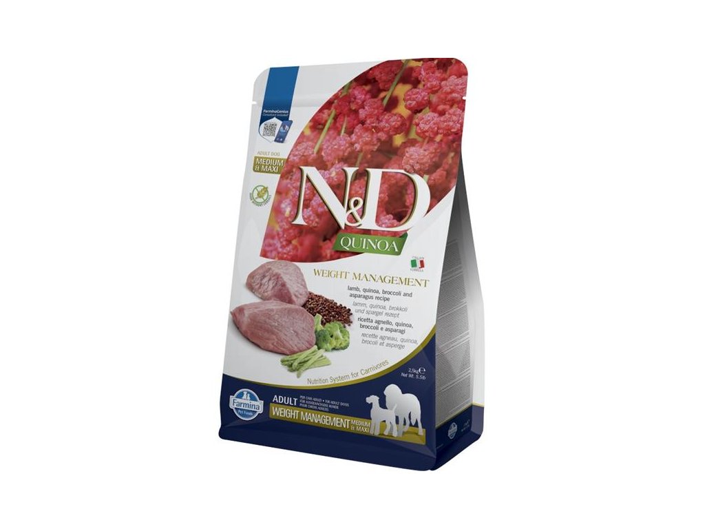 Farmina N&D Quinoa Weight Management je krmivo pro výživu dospělých psů středních a velkých plemen určené ke snížení nadměrné tělesné váhy. Hlavním zdrojem vysoce kvalitních bílkovin v krmivu je hypoalergenní jehněčí maso.