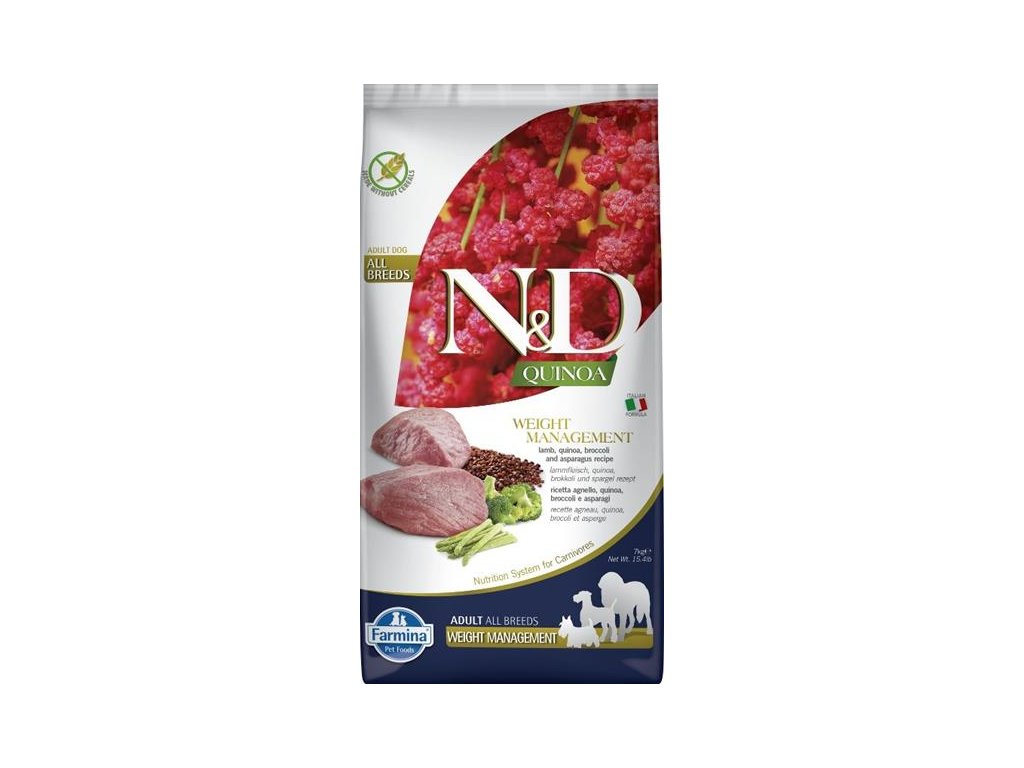 Farmina N&D Quinoa Weight Management je krmivo pro výživu dospělých psů středních a velkých plemen určené ke snížení nadměrné tělesné váhy. Hlavním zdrojem vysoce kvalitních bílkovin v krmivu je hypoalergenní jehněčí maso.