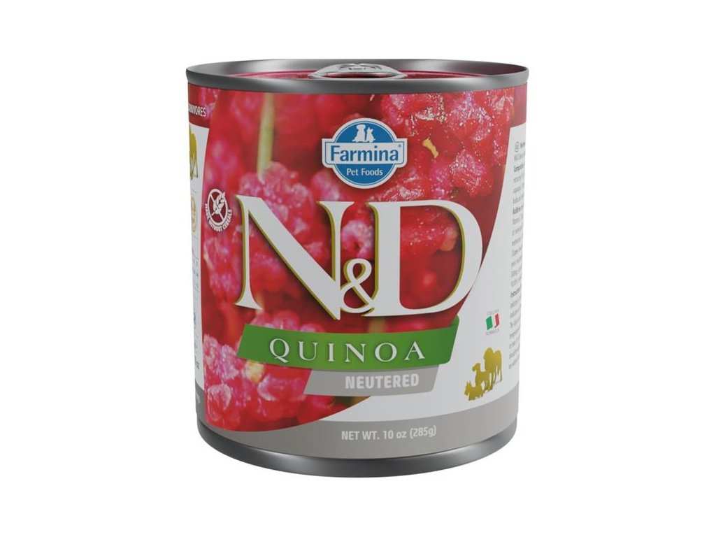 Kompletní vlhké krmivo je určené pro dospělé kastrované psy všech plemen. Hlavním zdrojem vysoce kvalitních bílkovin je vepřové maso (plec a koleno). Přidaná quinoa v bio kvalitě pěstovaná v Itálii podporuje trávení, absorpci živin a celkově zdraví trávicího traktu. Dále je bohatá na vzácné aminokyseliny a přírodní antioxidanty a má nízký glykemický index. Rybí olej zaručuje optimální poměr omega-3 a omega-6 mastných kyselin pro dobrou kondici kůže a srsti a její regenerační schopnost. Přidaný glukosamin a chondroitin vyživují kloubní chrupavky a stimulují růst a regeneraci kloubních tkání. Krmivo neobsahuje obiloviny, geneticky modifikované suroviny, umělá barviva, bílkoviny ze sóji ani hormonální nebo antibiotická rezidua.