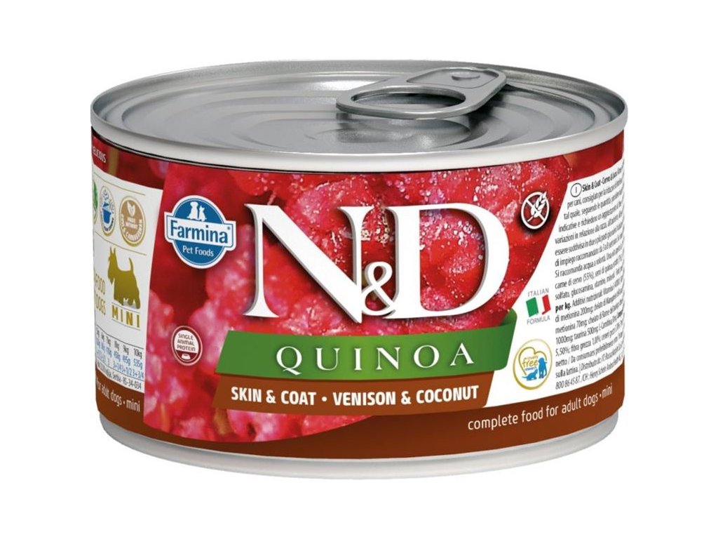 Farmina N&D Quinoa Venison & Coconut je krmivo pro zvláštní účely výživy určené k podpoře omezení intolerance určitých komponentů a živin.