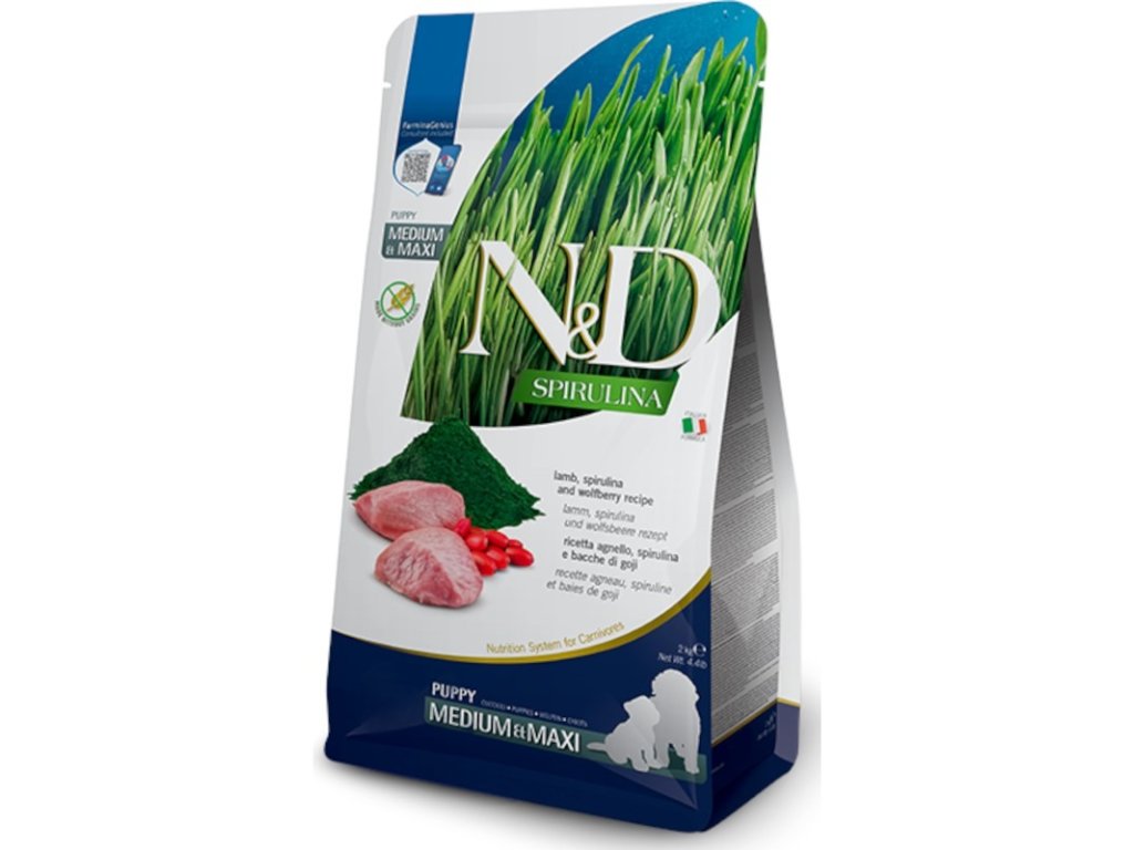 Vyvážené krmivo pro štěňata a březí nebo kojící feny středních a velkých plemen obsahuje více než 90 % proteinu živočišného původu. Hlavním zdrojem vysoce kvalitních bílkovin je hypoalergenní jehněčí maso. Přidaná superpotravina spirulina je zdrojem mastných kyselin, vitamínů a minerálů. Díky svým silným antioxidačním účinkům má pozitivní vliv na trávení, imunitní systém a kvalitu srsti a kůže. Napomáhá také ke správnému metabolismu tuků a sacharidů, díky čemuž má pozitivní vliv na udržení štíhlé postavy. Rybí olej zaručuje optimální poměr omega-3 a omega-6 mastných kyselin pro dobrou kondici kůže a srsti a její regenerační schopnost. Přídavek glukosaminu a chondroitinu vyživuje kloubní chrupavky, stimuluje růst a ochraňuje klouby. Krmivo neobsahuje obiloviny, geneticky modifikované suroviny, umělá barviva, bílkoviny ze sóji, hormonální ani antibiotická rezidua.