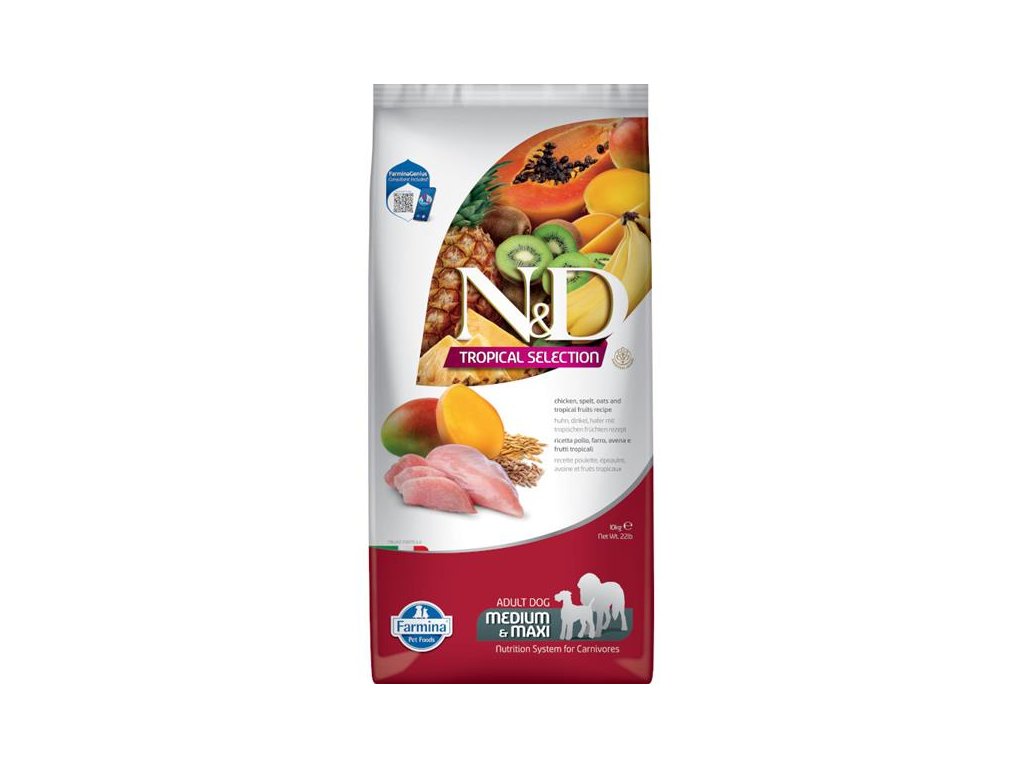 Kompletní nízkoobilné krmivo s kuřecím masem a tropickým ovocem pro dospělé psy středních a velkých plemen. Řada N&D Tropical Selection v sobě kombinuje kvalitní zdroje živočišných bílkovin, vysoce kvalitní obiloviny a chutné tropické ovoce pro nasycení vašeho zvířecího kamaráda.Granule řady Tropical Selection navazují na řadu nízkoobilných krmiv Ancestral Grain, v nichž je maso doplněno ovsem a špaldou. Tyto „staré obilniny“ se vyznačují nízkým glykemickým indexem a tím prodlužují dobu sytosti. Chutnost krmiva zvyšuje přidané tropické ovoce, jako je papája, mango, kiwi, ananas a banán, bohaté na přírodní antioxidanty a vitamíny.
