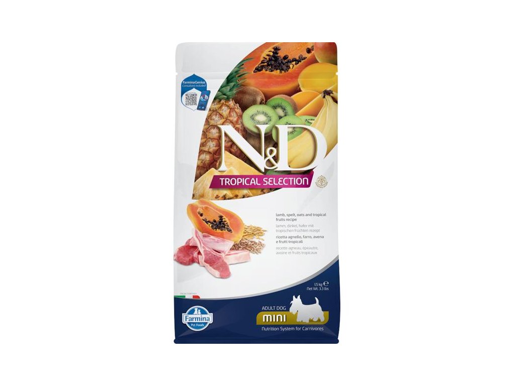 Kompletní nízkoobilné krmivo s jehněčím masem a tropickým ovocem pro dospělé psy malých plemen. Řada N&D Tropical Selection v sobě kombinuje kvalitní zdroje živočišných bílkovin, vysoce kvalitní obiloviny a chutné tropické ovoce pro nasycení vašeho zvířecího kamaráda.Granule řady Tropical Selection navazují na řadu nízkoobilných krmiv Ancestral Grain, v nichž je maso doplněno ovsem a špaldou. Tyto „staré obilniny“ se vyznačují nízkým glykemickým indexem a tím prodlužují dobu sytosti. Chutnost krmiva zvyšuje přidané tropické ovoce, jako je papája, mango, kiwi, ananas a banán, bohaté na přírodní antioxidanty a vitamíny.
